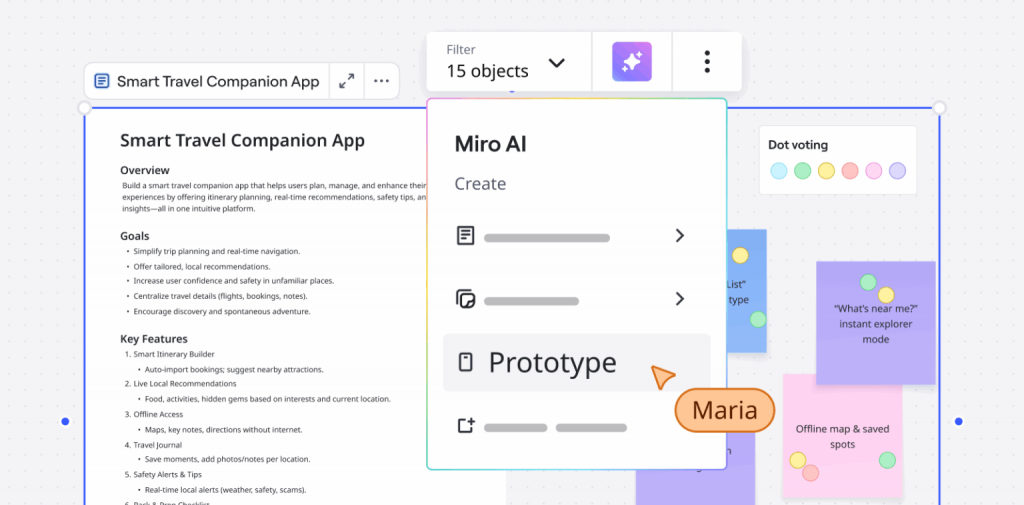 - Gehen Sie von Ihren Ideen aus: Wählen Sie Ihre Haftnotizen aus einem Brainstorming oder einem PRD aus oder beschreiben Sie Ihre Idee in einer Eingabeaufforderung, um in wenigen Minuten einen Prototyp mit mehreren Bildschirmen zu erstellen – bereit für Diskussionen oder Feedback.