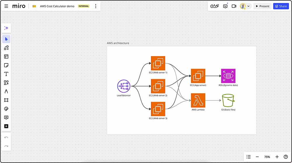 Egal, ob du sie manuell erstellst oder über die AWS Cloud View App (derzeit in der Beta-Phase) importierst – sobald AWS-spezifische Formen erkannt werden, zeigt Miro automatisch passende Werkzeuge wie den AWS Cost Calculator, Cloud View und Filterfunktionen an.