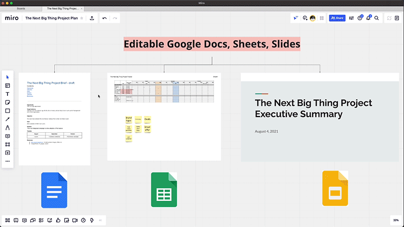 Die verbesserte Google-Drive-Integration macht Miro noch leistungsfähiger: Du kannst Google Docs, Sheets und Slides direkt in deine Whiteboards einbetten und dort in Echtzeit oder asynchron bearbeiten. Alle Inhalte bleiben automatisch zwischen Miro und Drive synchronisiert – so ist dein ganzes Team jederzeit auf dem aktuellen Stand. Hinweis: Die Installation von „Google Drive für Miro“ ist erforderlich.