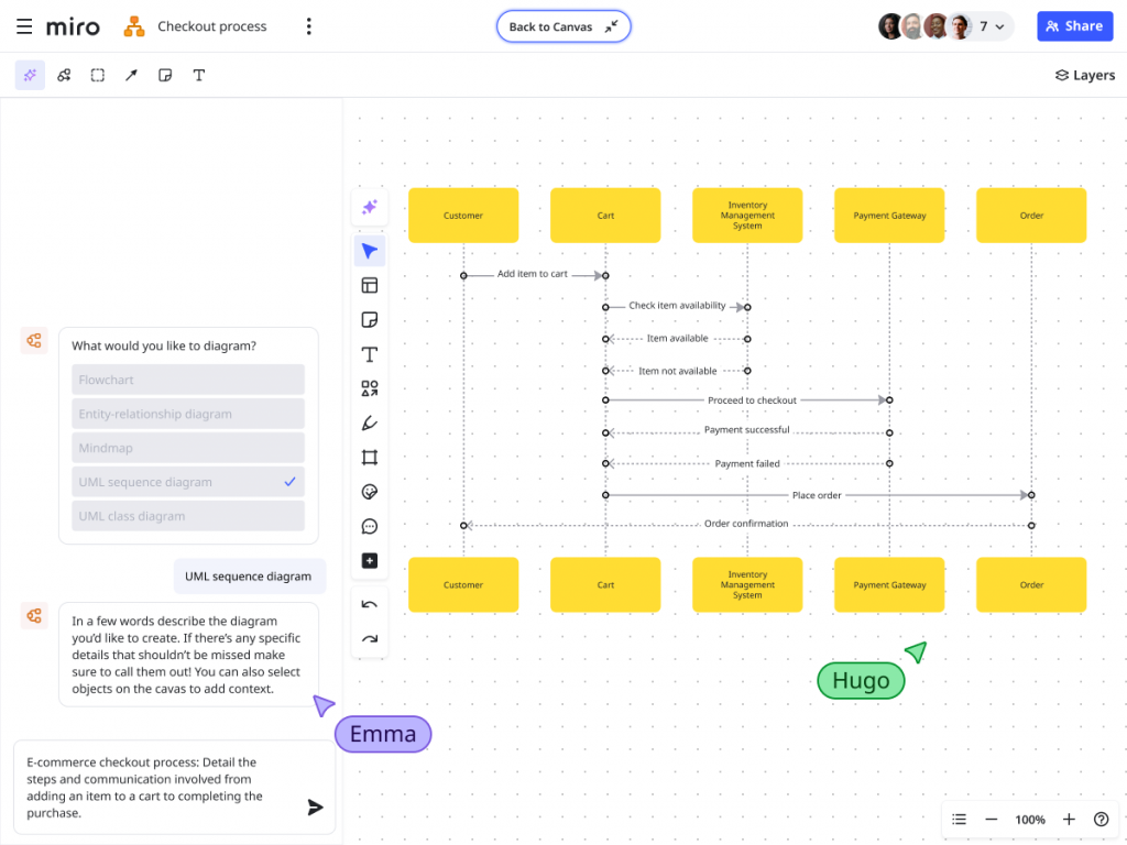 Miros Diagramming‑Funktionen haben sich rasant weiterentwickelt. Allein in den letzten 12 Monaten hat das Team Layer, benutzerdefinierte Formenpakete und einen Fokusmodus hinzugefügt, der nicht essenzielle Elemente der Benutzeroberfläche ausblendet. „Die Leute wussten bereits, wie man Diagramme erstellt, aber wir wollten es wirklich zehnmal schneller machen“, erklärt David. Doch es steht eine noch größere Veränderung bevor: KI wird eine völlig neue Art einläuten, über Diagramming nachzudenken.